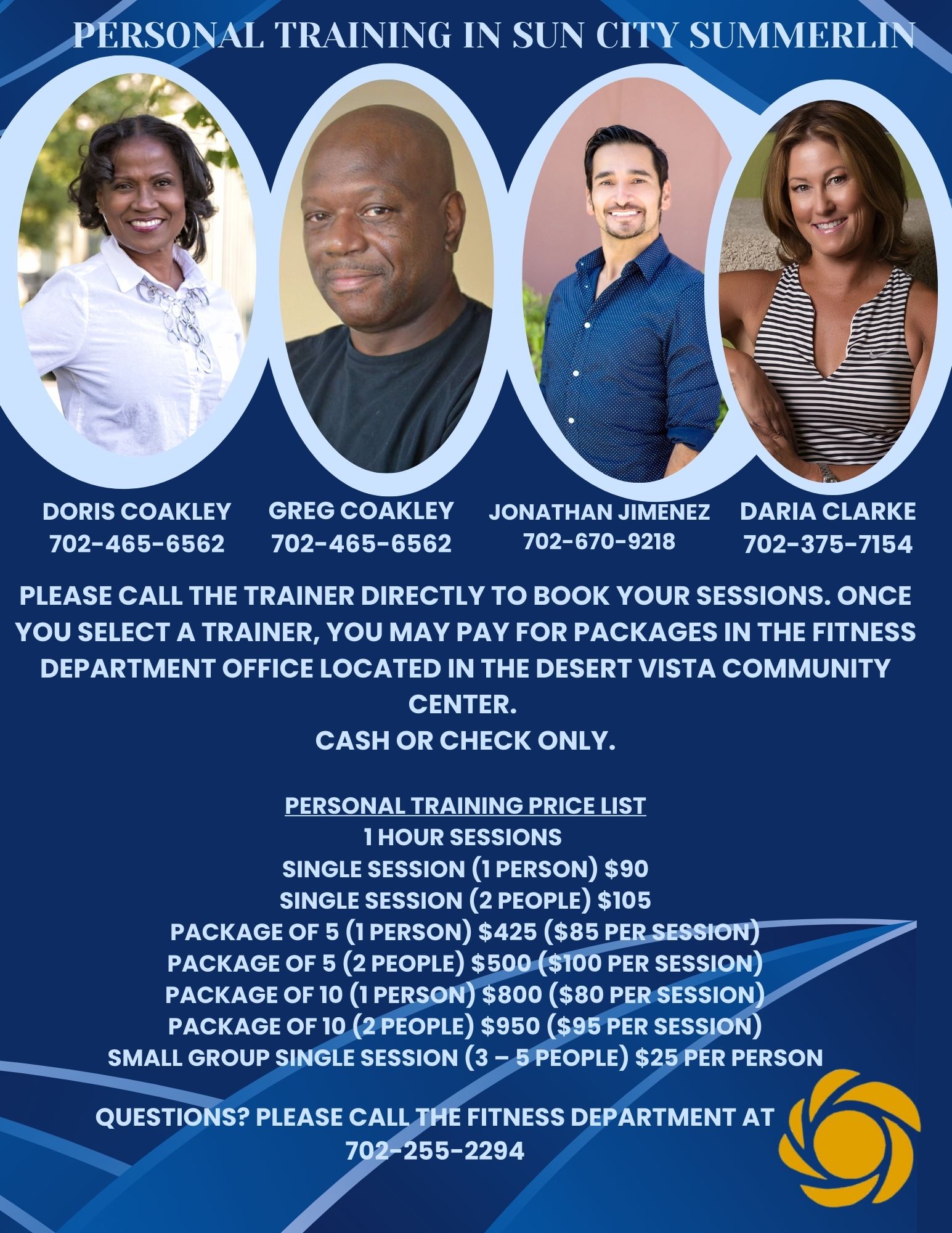 Fitness classes have been added to the Zoom Fitness Offerings for the community. These are LIVE classes conducted in the fitness centers that can also be attended via Zoom. This is a great opportunity to continue taking classes while you are traveling, if the class is too crowded, or if you prefer to take class from the comfort of your home. Simply click on the link to the classes and join! 7am Tuesdays/Thursdays Strength & Tone https://us02web.zoom.us/j/85799138654?pwd=MC9OcXFWL21uUUs0clJCbmNFSmlwUT09 Meeting ID: 857 9913 8654 Passcode: 762973 10am Mondays-Fridays Sit & Be Fit https://us02web.zoom.us/j/84256252272?pwd=M3JCNkVpbVg3MFM1ajM3aDROc1c2QT09 Meeting ID: 842 5625 2272 Passcode: 960703 11am Mondays-Fridays Sun City Strength https://us02web.zoom.us/j/84399088225?pwd=UXRkQkozUmYvSytxN2czT3RNWU53Zz09 Meeting ID: 843 9908 8225 Passcode: 442893 5:30pm Tuesdays Sun City Strength https://us02web.zoom.us/j/84819348793?pwd=b1lsZTlMazVrR01wbUc3WitaeXhqdz09 Meeting ID: 848 1934 8793 Passcode: 558392 Please contact the Fitness Department for any questions at 702-255- 2294.